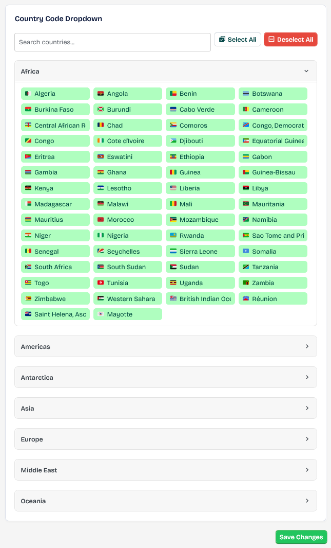 Through this list, you can enable and disable the countries you need to appear on your site to accept the autocorrect process and support them in your list of phone number fields.