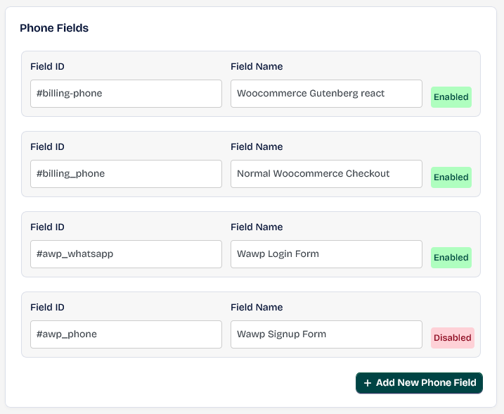 Phone Fields setting area can support the country code feature for any number input and works programmatically based on the input ID. #billing-phone: used for Woocommerce Gutenberg react #billing_phone: used for Normal Woocommerce Checkout #awp_whatsapp: used for Wawp Login Form #awp_phone: used for Wawp Signup Form