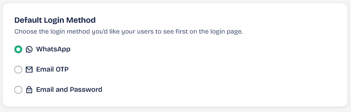 Choose the login method you’d like your users to see first on the login page. If you select any of the available options, it will be the first way the user will find to log in.