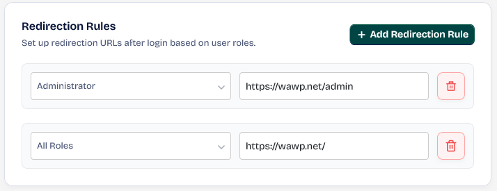 Set up redirection URLs after login based on user roles. For example, you can direct the manager to the administration control panel, the client to the orders area, and any other role to the main page, my account area, or any other place as you wish. To do this, just click on Add Redirection Rule.
