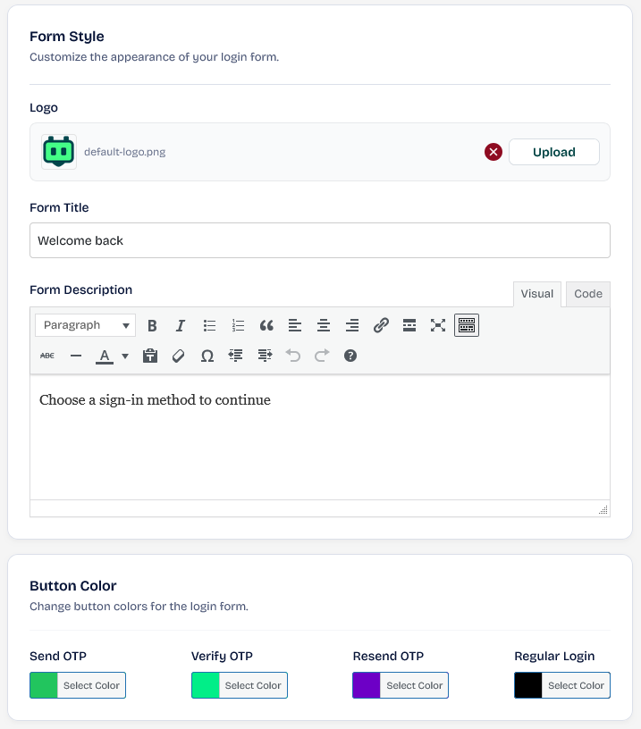 Customize the appearance of your login form. You can use this area to customize the button and text above the login form.