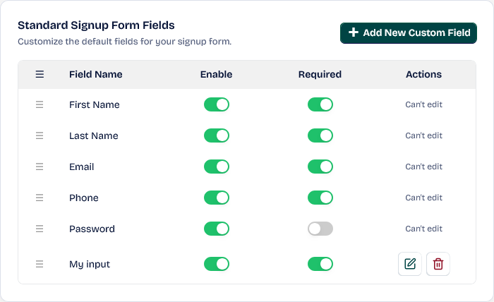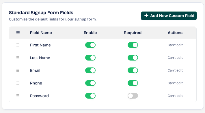This area includes the basic information for your WordPress account and the data it will collect from your customer when they register.