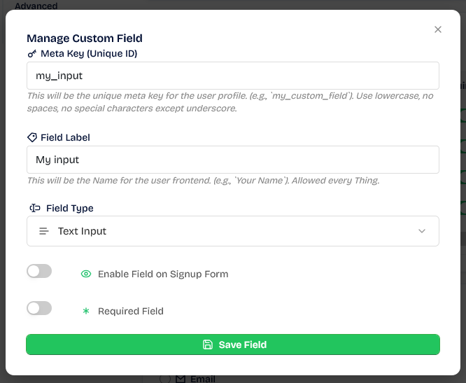 Enable Field on Signup Form: You can specify whether this field will be available on the registration form now. Why not just have it ready without making it visible to the user