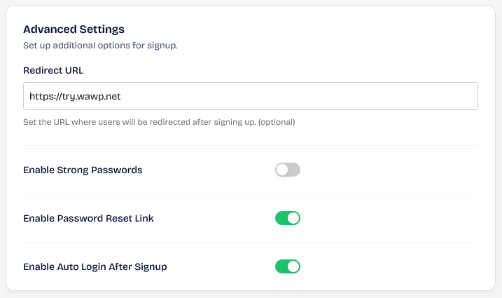 Enable Auto Login After Signup: If you want your client to log in directly, enable it. If you want him to log in himself after registration, disable it. If it is active, he will be directed based on the login settings, not the registration.