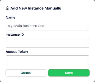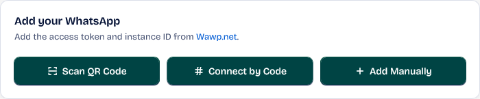 Add Manually: This method is common if you have previously connected your phone number via Wawp.net and want to link your number. You can just paste a custom name from your own and the installation ID and access token from the system.