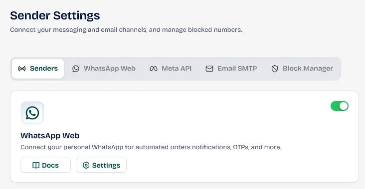 First, activate the WhatsApp Web feature from Sender settings within the Wawp plugin.